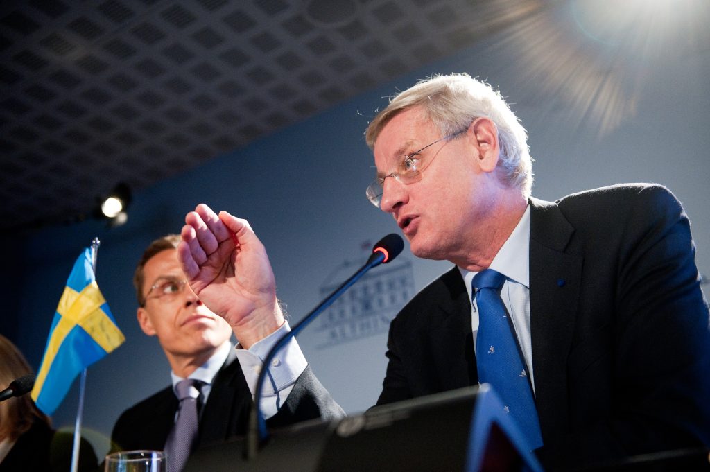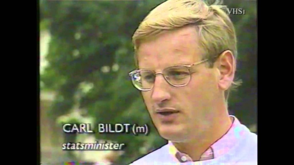 L’homme qui fit entrer la Suède dans l’UE. C’est sous les coups des européistes et de la gauche suédoise que la monarchie suédoise fut dépouillée de toutes ses prérogatives politiques, par le changement de la Constitution suédoise, en 1974. Bildt se présenta pour la première fois aux élections législatives et fut élu (1979-2001), restant vissé à son siège pendant de très longues années. Il fut élu président du Parti Modéré du Rassemblement (Moderata Samlingspartiet), une formation politique libérale et conservatrice, ayant alors singulièrement dérivé de la gauche vers le centre-droit (1986). En quelques années il s’imposa comme la grande figure politique du moment, atteignant le sommet du pouvoir. Il fut nommé Premier ministre de la Suède (1991-1994). Il entama immédiatement des négociations pour faire entrer la Suède dans l’UE (dès 1991). Le principal de son action fut d’emporter l’adhésion des Suédois, menant des campagnes, dont les financements resteront à analyser… lorsque des archives seront ouvertes. Malgré sa défaite politique aux élections de septembre 1994, le processus était très avancé et se solda par un référendum d’adhésion (13 novembre 1994). Le oui l’emporta par 52,2 %, contre 46,9 %, une victoire qui fit entrer la Suède dans l’UE (1er janvier 1995).