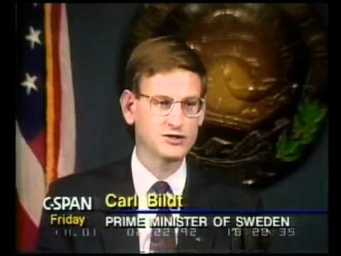 L’agent européiste et atlantiste. Il fut membre des Jeunes Européens fédéralistes (années 70). Ce mouvement prônait la création d’une Europe fédérale, où les frontières seraient bannies et ouvertes, les souverainetés abandonnées au profit d’une entité fédérale européenne supranationale. La Suède n’était alors ni membre de l’Union européenne, ni membre de l’OTAN, dans une tradition où le pays était resté sur des positions neutres. La Suède fut l’un des rares pays à ne pas participer aux deux guerres mondiales et à ne pas subir d’événements révolutionnaires majeurs. Elle avait pourtant été agitée par une pression révolutionnaire, au moment de la révolution bolchevique en Russie, pays voisin (1917-1918), mais n’entra pas en ébullition. De fait la monarchie suédoise survécut à l’hécatombe des têtes couronnées, bien que le roi de Suède, officiellement chef de l’État, n’occupe plus qu’une fonction cérémonielle et représentative.
