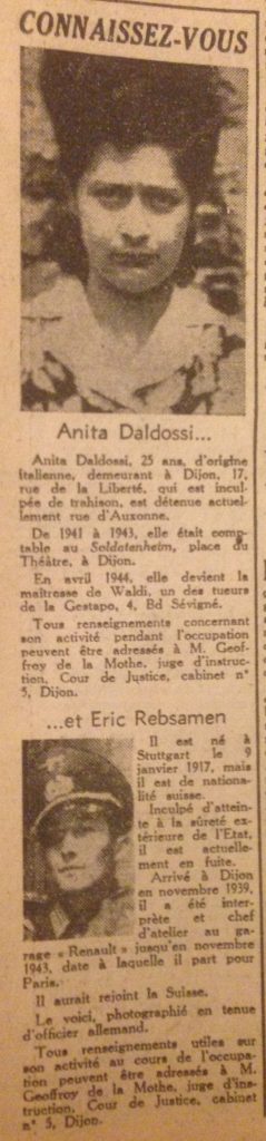 « et Eric Rebsamen, il est né à Stuttgart le 9 janvier 1917, mais il est de nationalité suisse. Inculpé d’atteinte à la sûreté de l’État, il est actuellement en fuite. Arrivé à Dijon en novembre 1939, il a été interprète et chef d’atelier au garage Renault, jusqu’en novembre 1943 [il y a ici une erreur, il prit la fuite de Dijon, en juin 1944 et resta à son poste au garage Renault jusqu’à cette date], date à laquelle il part pour Paris. Il aurait rejoint la Suisse. Le voici photographié en tenue d’officier allemand. Tous renseignements utiles sur son activité au cours de l’occupation peuvent être adressés à Monsieur Geoffroy de la Motte, juge d’instruction, Cour de Justice, cabinet n° 5, Dijon ».