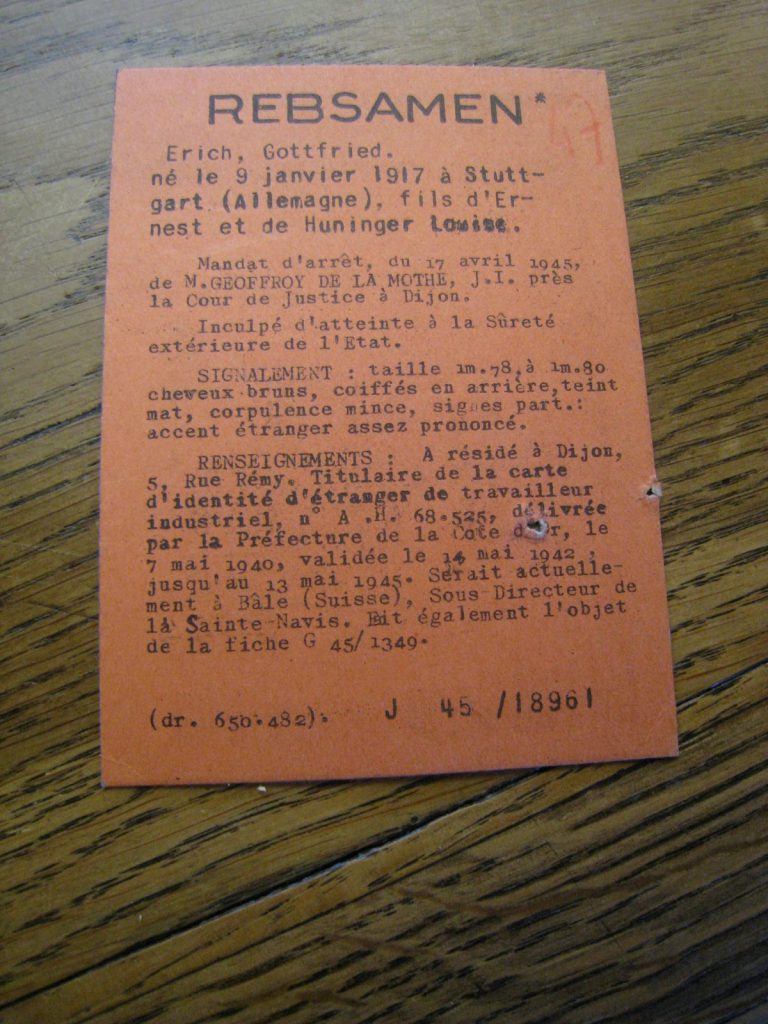 Puis son signalement et fiche de la police française : « Rebsamen, Erich, Gottfried, né le 9 janvier 1917, à Stuttgart, Allemagne, fils d’Ernest et de Huninger Louise. Mandat d’arrêt du 17 avril 1945, de Monsieur Geoffroy de la Mothe, Juge d’instruction près la Cour de Justice à Dijon. Inculpé d’atteinte à la sûreté de l’État. Signalement : taille d’1m78 à 1m80, cheveux bruns, coiffés en arrière, teint mat, corpulence mince, signes particuliers, accent étranger assez prononcé. Renseignements : a résidé à Dijon, 5 rue Rémy, titulaire de la carte d’identité d’étranger de travailleur industriel, n° A.H 68 525, délivrée par la Préfecture de la Côte d’Or le 7 mai 1940, validée le 14 mai 1942, jusqu’au 13 mai 1945. Serait actuellement à Bâle, Suisse, Sous-directeur de la Sainte-Navis. Il fait également l’objet de la fiche G 45/1349 ».