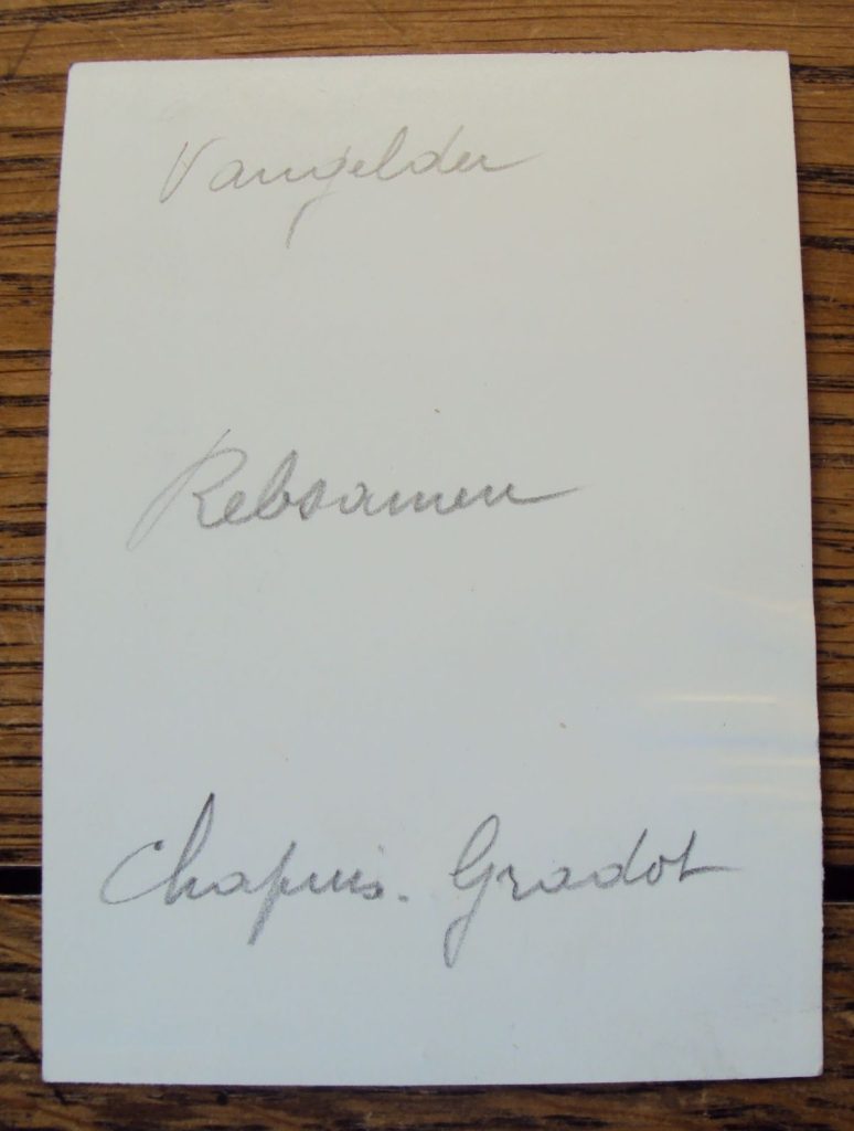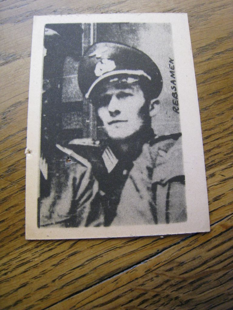 Enfin, la photo qui était apparue sur Internet vers 2013-2014, il s’agit de l’original, exemplaire mis au point par la Police française, via une autre photo. Cette autre cliché était une photo d’Erich Rebsamen en compagnie de deux autres personnes en uniformes allemands, nous aurons à en reparler, de comment, où et quand fut prise cette photo. Derrière la photo trois noms : Vangelder, Rebsamen et Chapuis-Gradot. Les deux autres hommes, comme lui, servaient la Gestapo allemande, le troisième assurément français. Je n’ai pas pu remonter leur piste.