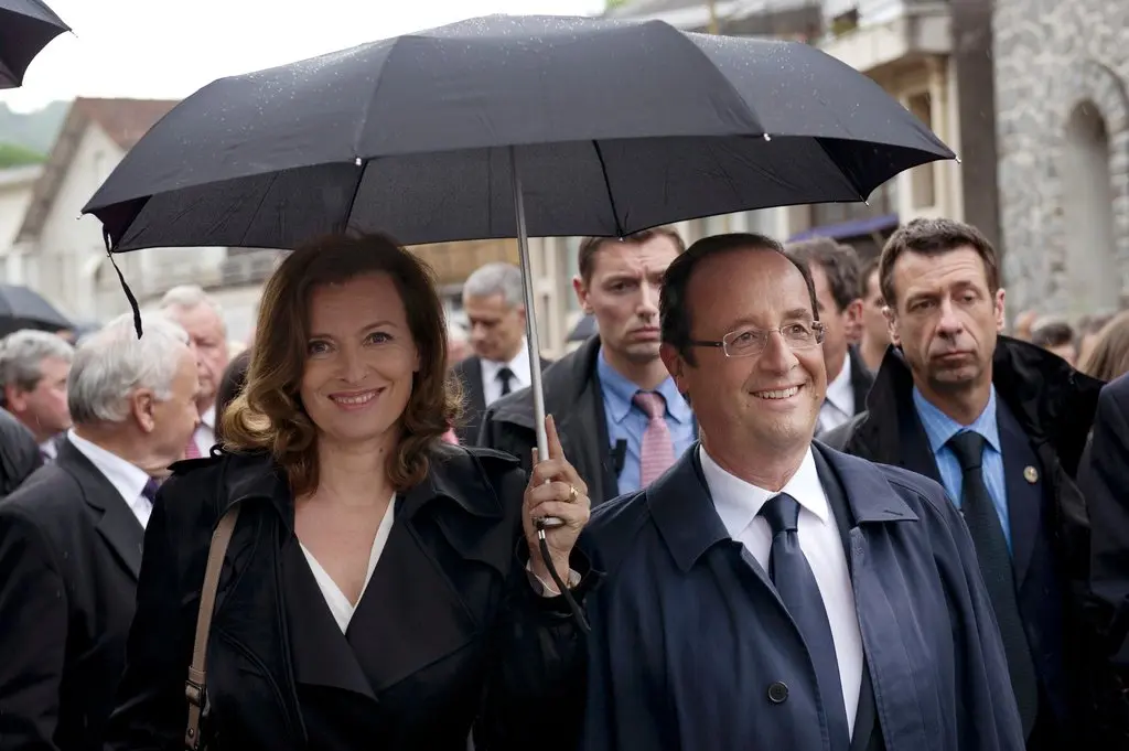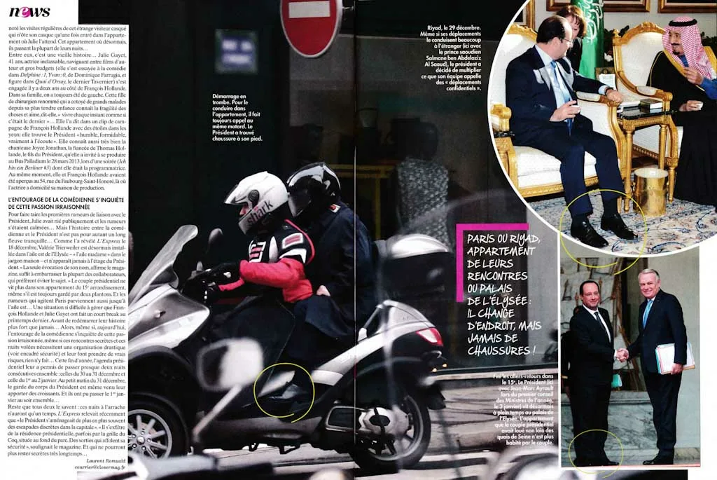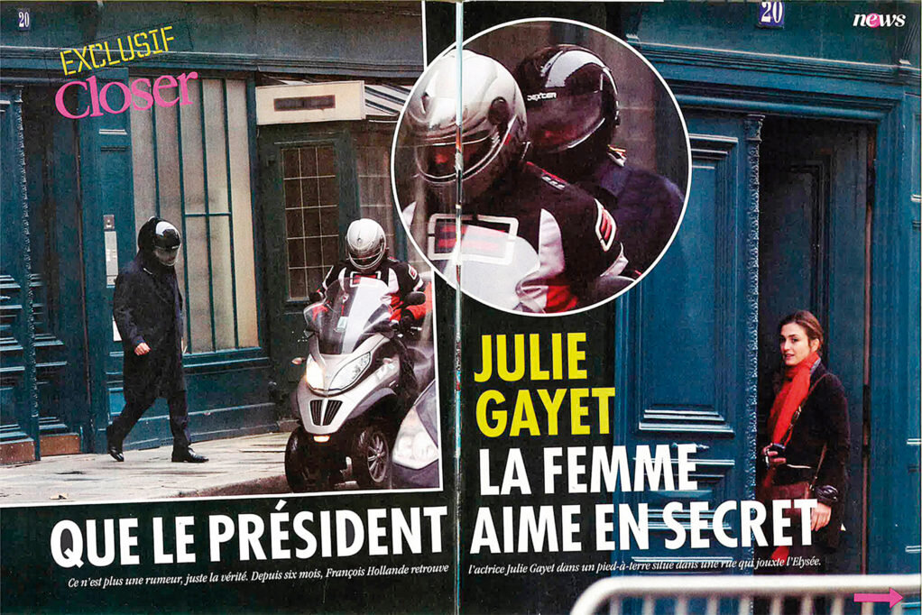 L’explosion de l’affaire Hollande-Gayet. Lorsque François Hollande fut élu Président de la République (mai 2012), il ne se trouvait plus en couple avec Ségolène Royal, qui fut à son bras dans une union libre de 1978 à 2007. Cette séparation fut officiellement annoncée peu après l’élection présidentielle, où Ségolène Royal fut battue par Nicolas Sarkozy (2007). Elle avait été gardée secrète pour ne pas interférer dans l’élection. Le couple avait eu cependant 4 enfants, Thomas (1984), Clémence (1985), Julien (1987) et Flora (1992). L’annonce de cette séparation fut faite par François Hollande lui-même, dans une interview accordée à l’AFP (juin 2007), mais la surprise est qu’il annonça avoir une nouvelle compagne, Valérie Trierweiler, une journaliste sulfureuse. A l’élection de son compagnon, elle devint « la première dame » et s’afficha bientôt publiquement, créant le scandale, dans un épisode d’une visite à Tulle, où pour empêcher un journaliste de filmer, elle attrapa par la capuche cet homme, le tirant en arrière. Personnage cassante, peu populaire, altière et arrogante, elle détonnait beaucoup par rapport aux « premières dames » précédentes, par ses comportements et une certaine forme de jubilation à être devenue « la femme du Président ». Mais le 10 janvier 2014, le magazine people Closer publia des photos explosives. Elles montraient le Président Hollande arrivant en scooter, escorté par un garde du corps et rendant visite à Julie Gayet, une actrice de cinéma, ayant un appartement très proche de l’Élysée, rue de la Circulaire, à Paris.