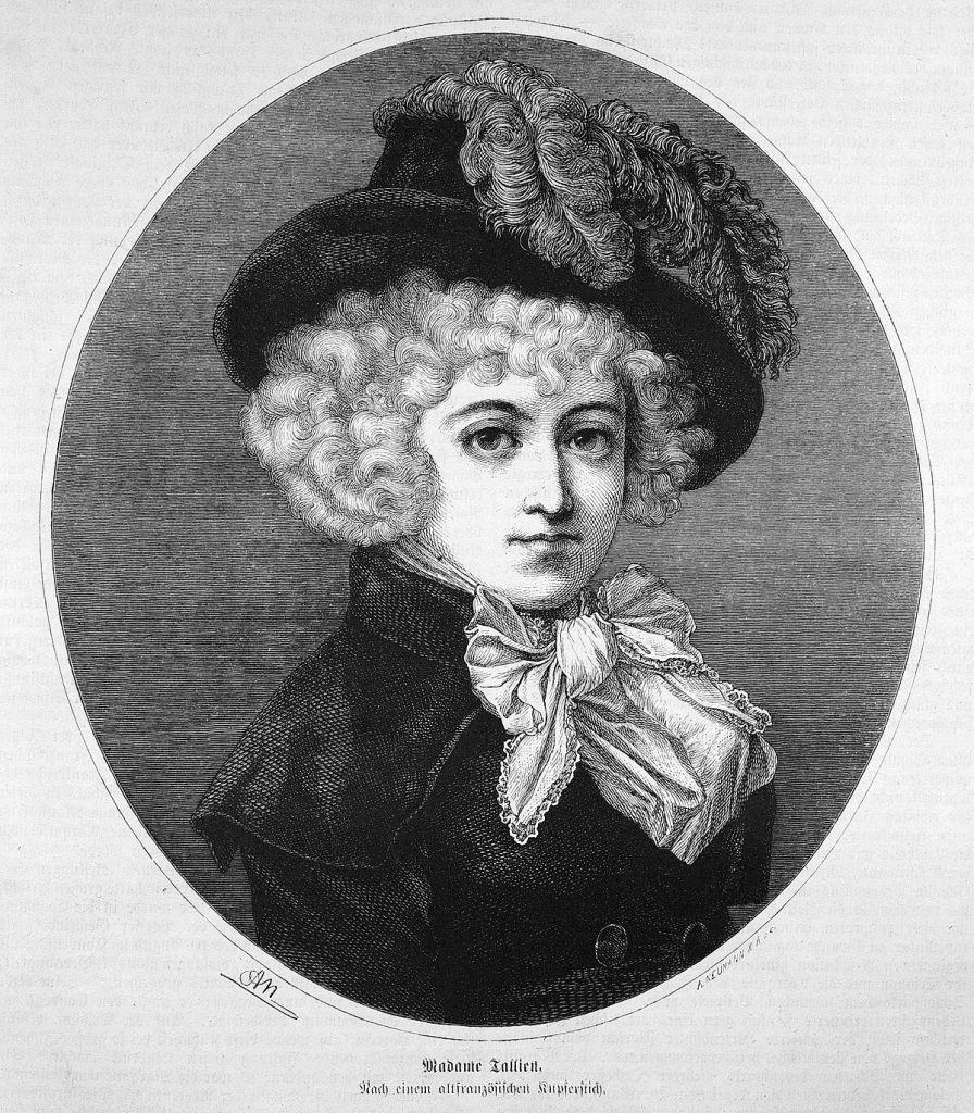 L’égérie du Directoire et « Première Dame » de la Révolution. Elle devait devenir la « reine de Paris », son salon se remplissant des hommes les plus puissants, notamment des Directeurs de la République, les hommes dirigeants la France thermidorienne. C’est dans son salon que Bonaparte devait rencontrer pour la première fois, Joséphine de Beauharnais. Dans une boulimie de fêtes, de soirées de prestiges, elle fut l’une des « Merveilleuses », une mode décadente fêtant la fin des rigueurs révolutionnaires, revenant au plaisir les plus libérés, y compris dans les mœurs. Elle imposa la mode des robes légères à l’Antique, sans manches et en mousseline blanche, transparentes et ne cachant pour ainsi dire rien… Le prince de Talleyrand, expert en « femmes » et futur Ministre des Affaires étrangères de Napoléon, déclara en la voyant : « il n’est pas possible de s’exposer aussi somptueusement ! ». Bien que s’étant mariée à Tallien (décembre 1794), ayant accouché d’une fille (1795, prénommée Rose-Thermidor-Laure-Joséphine), elle devait se détourner d’un mari falot, pour passer dans le lit de l’homme le plus puissant du moment, Paul Barras. De ce lit, elle passa bientôt dans celui d’un homme richissime, grand argentier du futur Consulat, et une pièce maîtresse du régime, le banquier Gabriel-Julien Ouvrard. Face à un mari littéralement éteint par l’égérie du Directoire, elle eut de ce banquier, 5 enfants, n’étant alors pas même divorcée (entre 1800 et 1804). Ce divorce interviendra plus tard en 1802. Elle aurait résisté aux avances du général Bonaparte, qui selon des témoignages à prendre avec circonspection, l’aurait courtisé, mais le petit général fut éconduit. Il devait ensuite se venger. La Première Dame de la Révolution, pour une fois n’avait pas eu de nez… la couronne impériale aura peut-être tenue à quelques parties fines et des galipettes savantes, que « La Tallien », lui refusa. Après le coup d’État du 18 Brumaire (novembre 1799), Bonaparte devint le maître de la France, pour longtemps, posant la couronne impériale sur sa tête (2 décembre 1804).